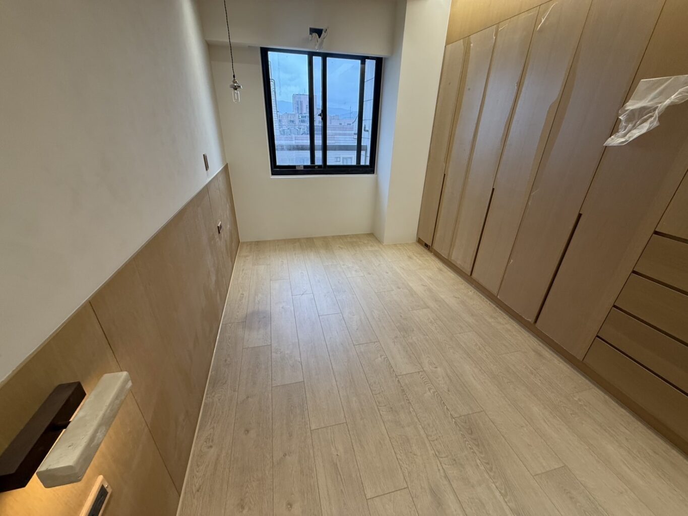 針對臥室空間,我們通常推薦暖色系或花紋乾淨的板材。若遇到小坪數的房型,我們更建議放棄跳色,直接將地板「全室延伸」至臥室。這樣能讓室內視覺更具連貫性,避免空間被反覆切割的感覺,如下案照片例呈現。