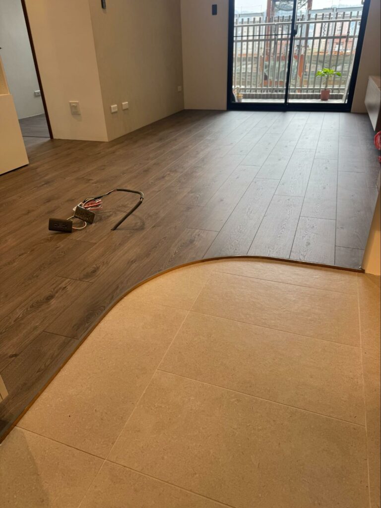 「地板再好,基底不平也會出問題。」 舊屋常有磁磚高低差或濕氣,新屋毛胚地也可能有不平整狀況。鋪設前務必確實檢查,若未做好整平與防潮處理,日後極易出現斷扣、異音或局部鼓起。