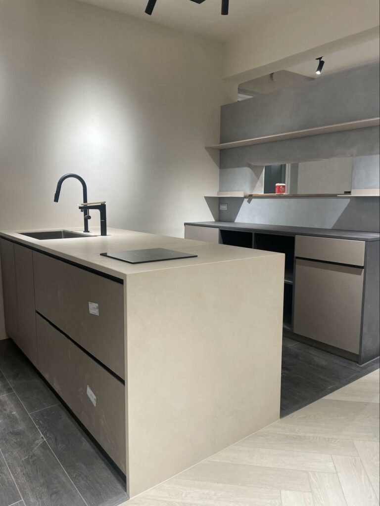第二張照片說明:沃登家居門市的廚房中島。在中島周圍,我們特別挑選了 Vitality 精品系列。考量到門市日常會有許多客人來回走動、討論材質,這款地板不僅完美撐起了空間的視覺美感,其優異的耐磨係數更是經得起高頻率的實用考驗。