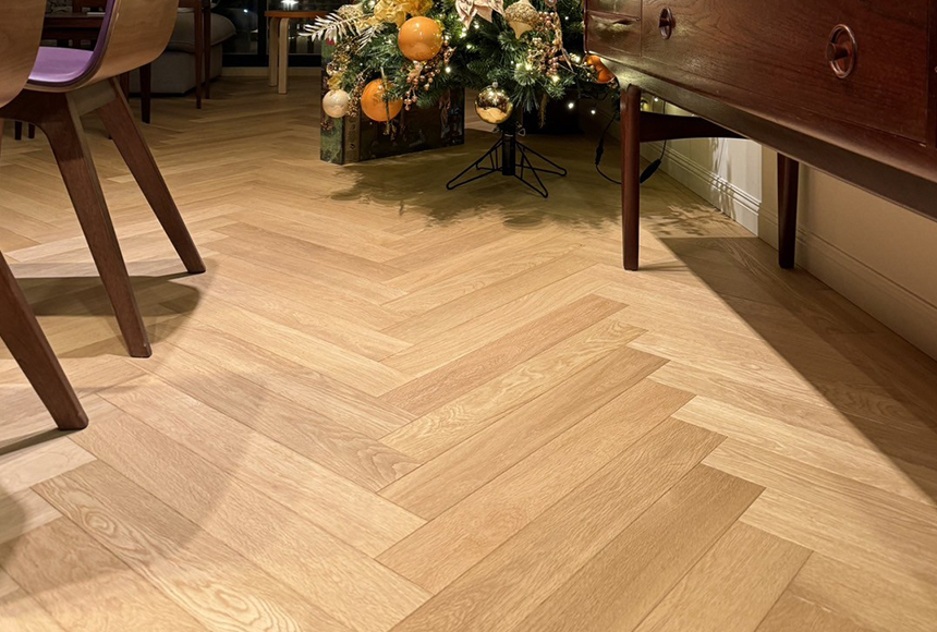 在本案中,沃登家居為客戶量身打造專屬地坪設計,選用海島型木地板,並採用經典的人字拼(Herringbone)鋪設工法,不僅展現出歐式經典的設計語彙,也在細節中傳遞出空間的節奏與層次美感。每一片木材均經嚴格挑選與精準加工,質地穩定、紋理清晰,展現自然材質的溫潤與高雅。