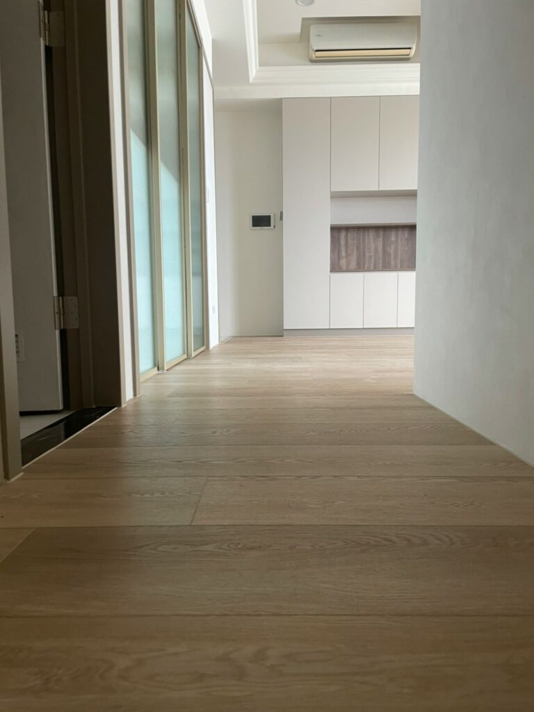 地板溫和的木質色澤,與空間中留白的牆面與家具形成柔和的對話,彼此不搶戲,卻相互襯托。光線灑落時,木地板所散發出的溫潤質感,為整體空間注入安定而舒適的氛圍,讓每一次回家,都像是一段緩慢而安心的過渡,從外界回到屬於自己的節奏。
